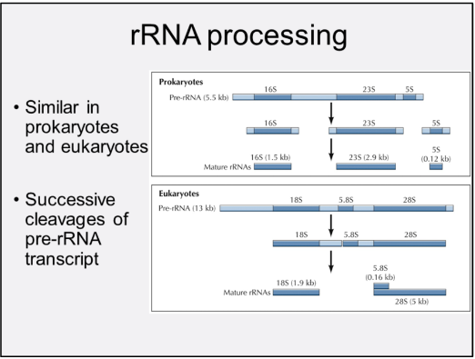 Bacteria have three rRNAs: 5S, 16S, 23S. These are equivalent to the 5S, 18S, and 28S eukaryotic rRNAs and are also derived by cleavage of a single transcript.