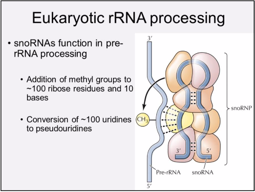 2 families of snoRNAs that associate with different proteins to catalyze methylation or formation of pseudouridines. snoRNAs contain ~15 nucleotides that are complementary to 18S or 28S rRNA – this region is the site of base modification.