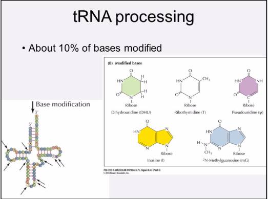 Functions of modified bases – most unknown, some play important roles in protein synthesis by altering base-pairing properties of tRNA molecule and stabilize hairpin loops