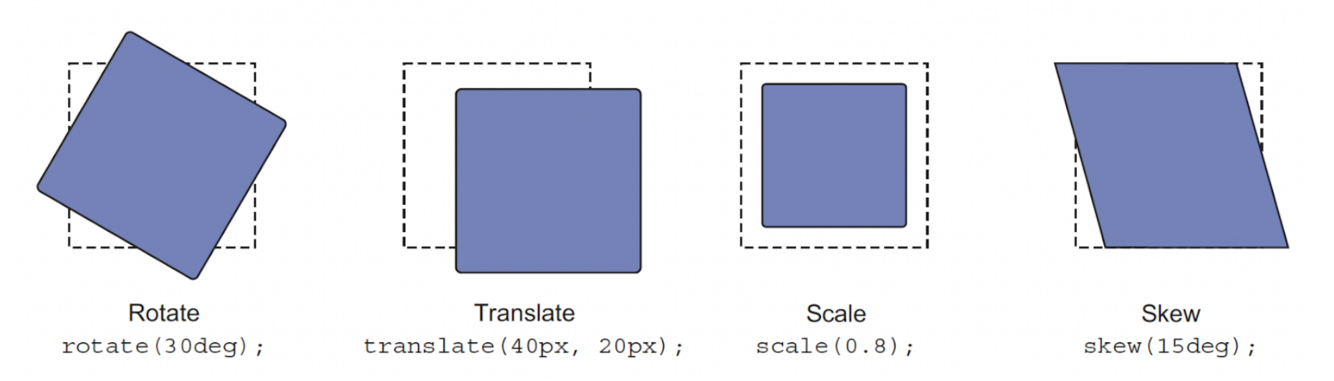 rotate(angle), rotateX(angle), rotateY(angle), rotateZ(angle), and rotate3d(x, y, z, angle).