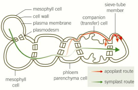 sucrose from the source travels through the cell walls and inter-cellular spaces to the companion cells and sieve elements by diffusion down a concentration gradient
