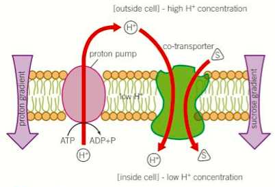 sucrose moves in with hydrogen ions thanks to co-transport protein