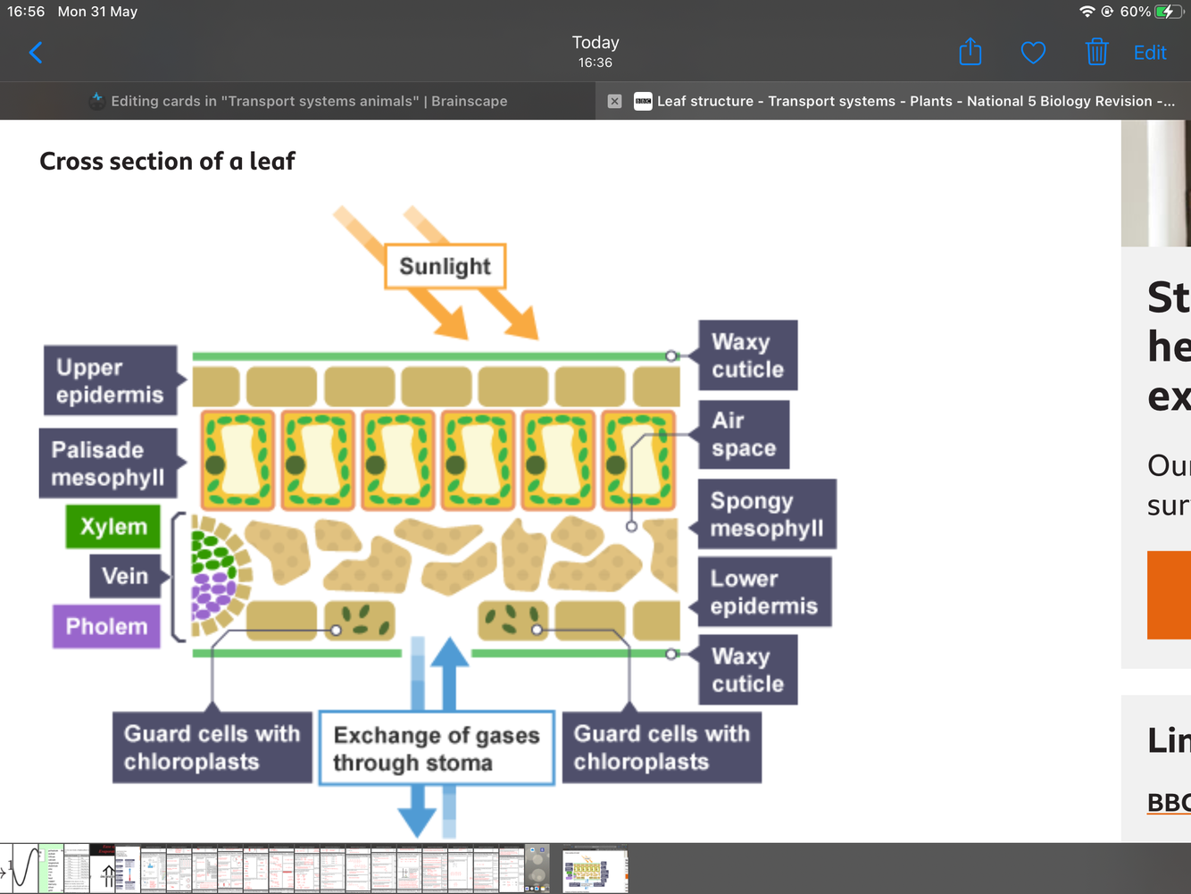 Upper Epidermis Palisade Mesophyll Spongy Mesophyll Vein (consisting of xylem and phloem) Lower Epidermis Guard Cells Stomata