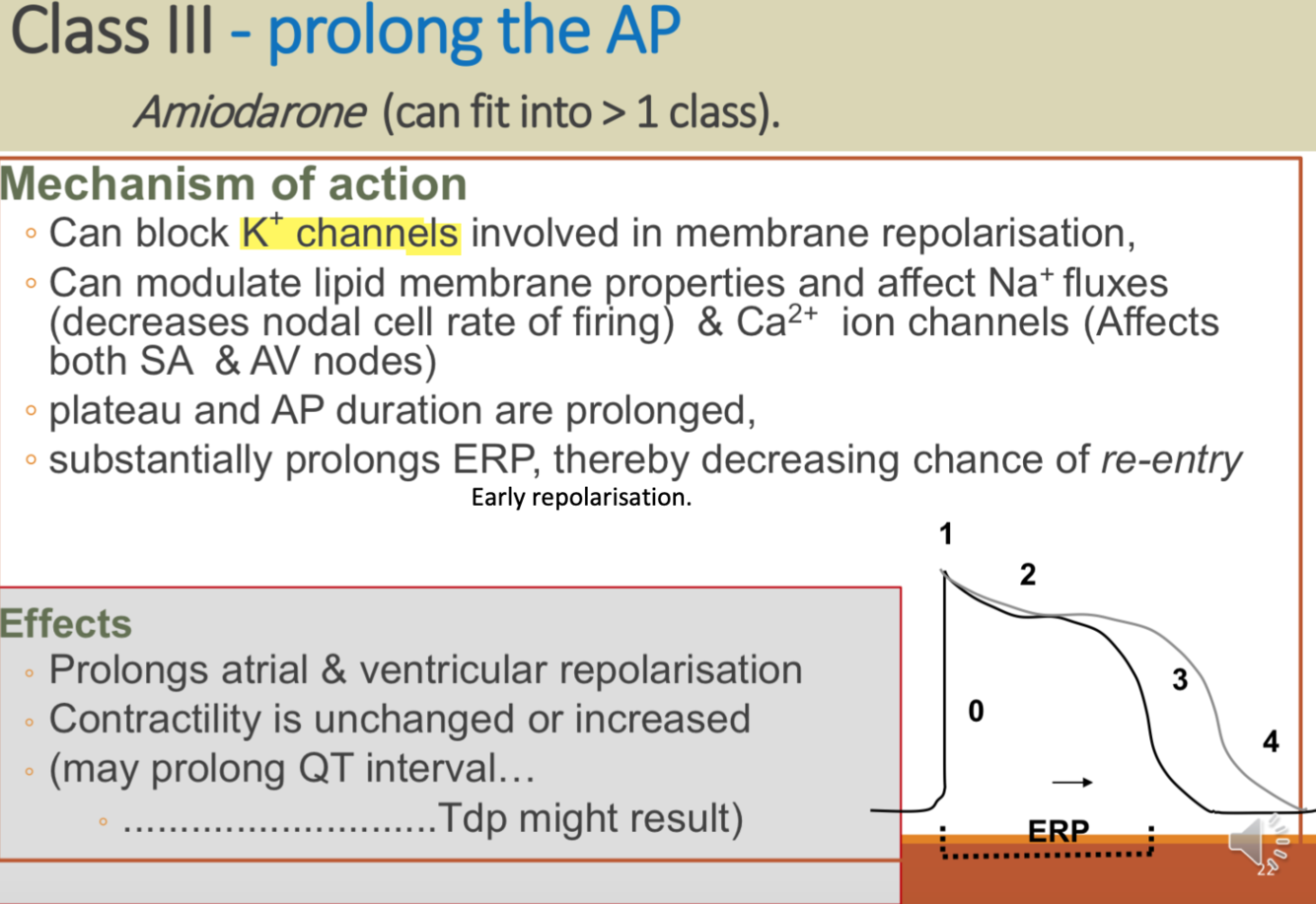 Block K+ channels involved in repolarisation therefore prolongs atrial and ventricular repolarisation.