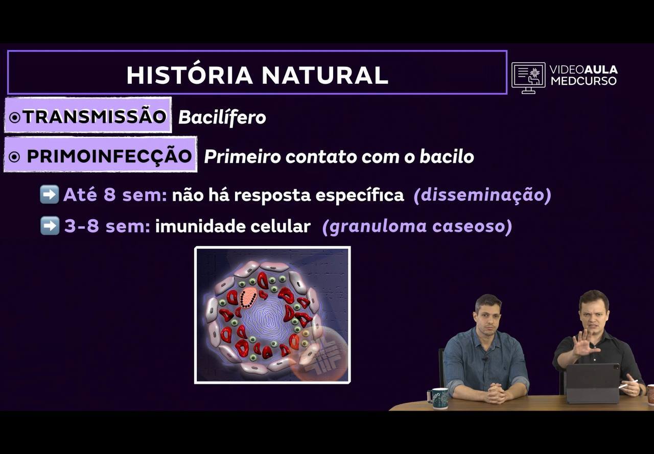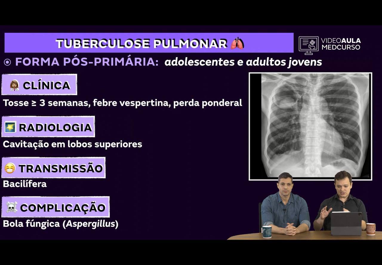 Tuberculose pós primária ➡️ Principalmente em adolescente e adulto. Os sintomas aqui é tosse por mais que 3 semanas, febre vespertino e perda ponderal. Essa tuberculose pós primária ocorre quando o granuloma CASEOSO ao redor do bacilo ele fica fragilizado com o crescimento novamente do bacilo (seja pela imunidade baixa do paciente ou por novo contato com o bacilo de Koch) que se rompe e vai para via aérea podendo ser transmitida ao tossir por exemplo.