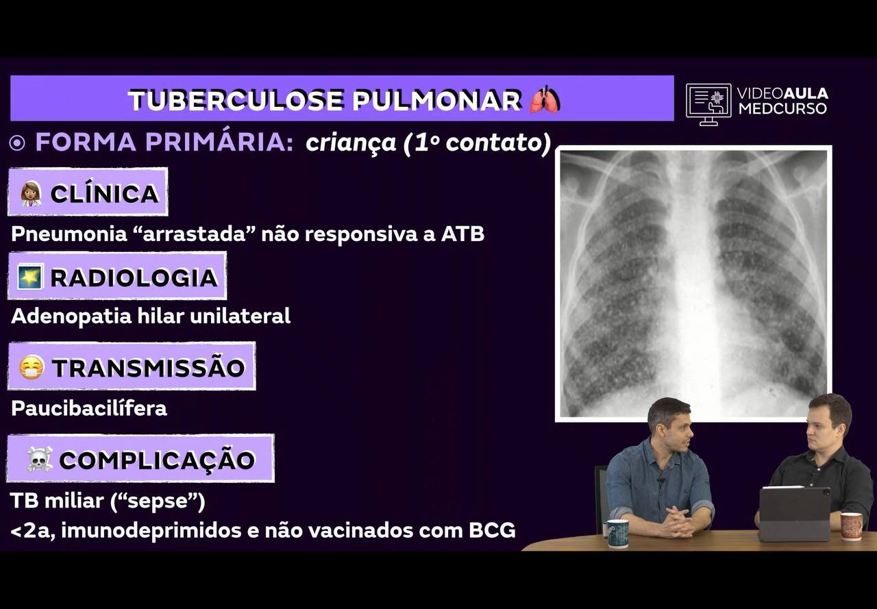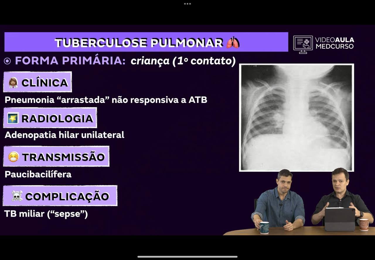 TB primária ➡️ Afeta principalmente as crianças pois como ela tem uma unidade não madura geralmente ao contato com o bacilo de Koch já causa a doença. Por ser um bacilo não agressivo ele gera um quadro mais arrastado então a criança vai apresentar tosse tosse tosse e um pouco de febre.