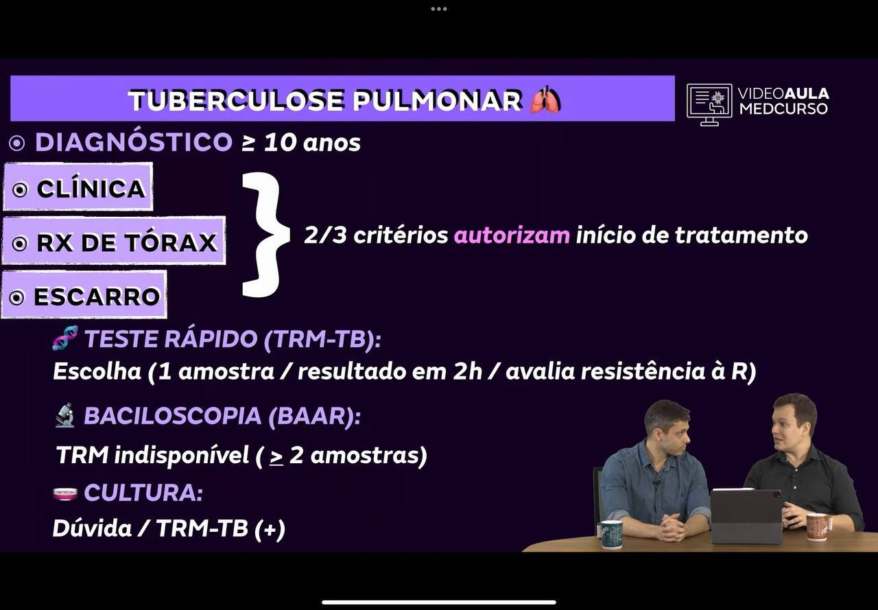 ⚠️Teste rápido molécular (TRM-TB) é o de primeira escolha pois precisa de apenas uma amostra e que fica pronta em 2 horas e avalia resistência do bacilo de Koch a rifampicina que é o principal medicamento usado para tratar tuberculose pulmonar. A baciloscopia (BAAR) é a segunda escolha pois é mais demorada e precisa no mínimo 2 amostras. A cultura é feita mais para documentar a presença de bacilo de Koch, caso não haja encontrado durante o tratamento ou durante dúvida diagnóstica ou após TRM-TB vim positivo.