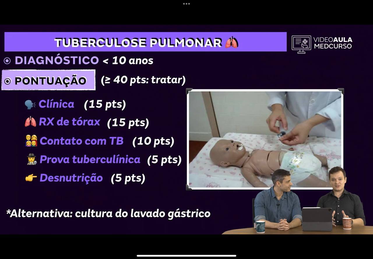 Com pontuação maior igual que 40 pontos. Sendo clínica sugestivo 15, RX de tórax sugestivo 15, contato com tuberculose 10, prova tuberculínica 5, e desnutrição 5 pontos.