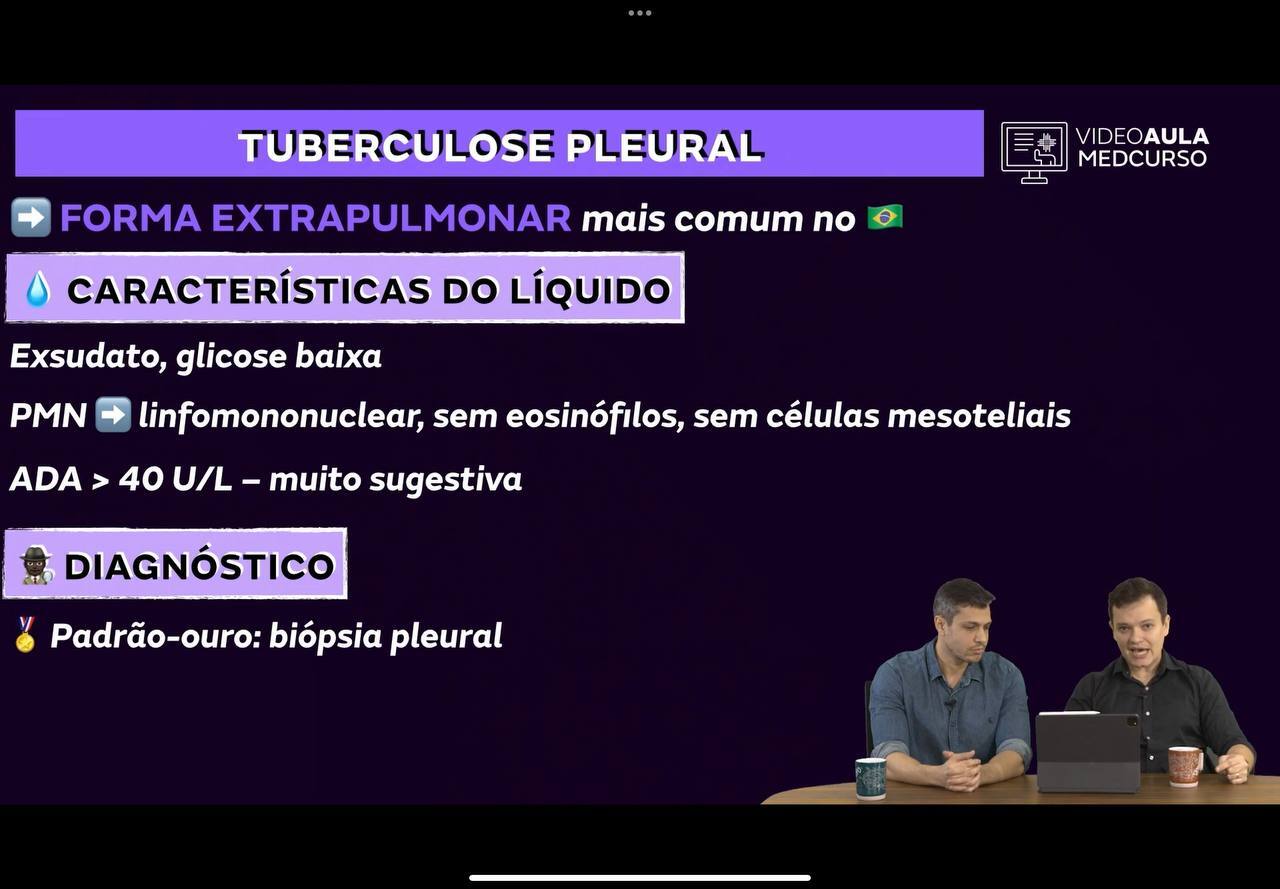Laboratório ➡️ O líquido da toracocentese vai vim com aspecto transparente, a bioquímica vem exudativo ( pois é um líquido que vem da inflamação a inflamação aumenta permeabilidade vascular o líquido extravasa para a cavidade pleural e fica um líquido em proteínas e glicose baixa.). A parte celular vem com predomínio de linfomononuclear sem eosinófilos e sem células mesoteliais (célula que reveste o interior da pleura, ela geralmente está presente em cancer pleural).