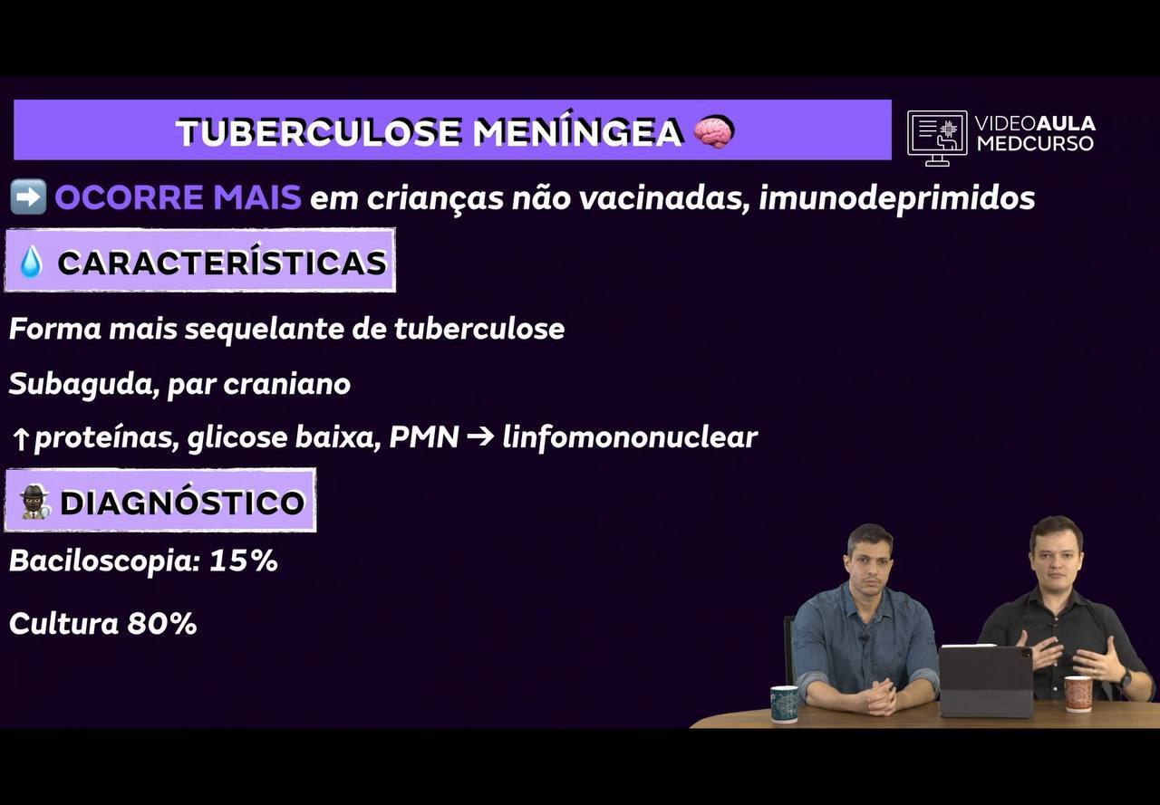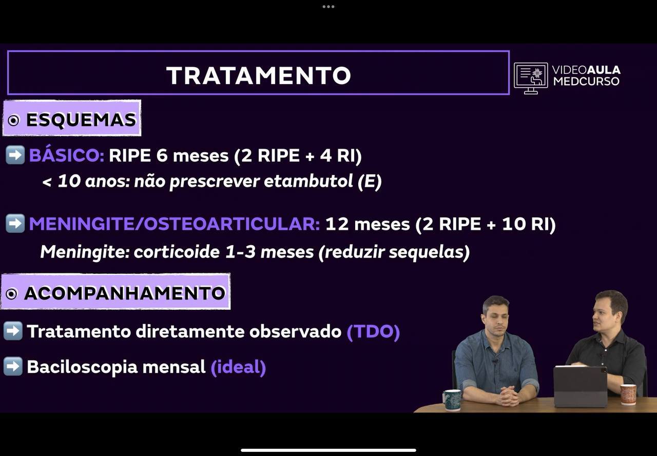 ⚠️⚠️ Na tuberculose meningea fazemos também corticoide em dose anti- inflamatoria com predinisona 40mg/dia durante os primeiros 3 meses do tratamento acima. Isso deve ser feito porque o bacilo de Koch fica grudado na meninge e quando começamos o tratamento para meningite tuberculínica acabamos por expor essa bactéria de uma maneira que o sistema imune vai agredir aquele local gerando uma grande inflamação, que no contexto da meninge é extremamente perigoso, então para evitar esse efeito maléfico da inflamação fazemos o melhor anti-inflamatório que existe que é o corticoide. Por isso que a tuberculose meningea é a mais sequelante.