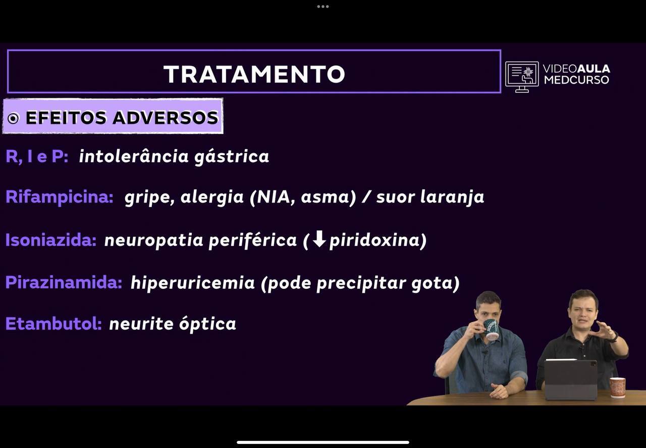 Pirazinamida ➡️ hiperuricemia ou seja pode precipitar uma crise de gota, isso não significa que pacientes que tem gota não pode usar pirazinamida, porém temos que alerta que isso pode acontecer.