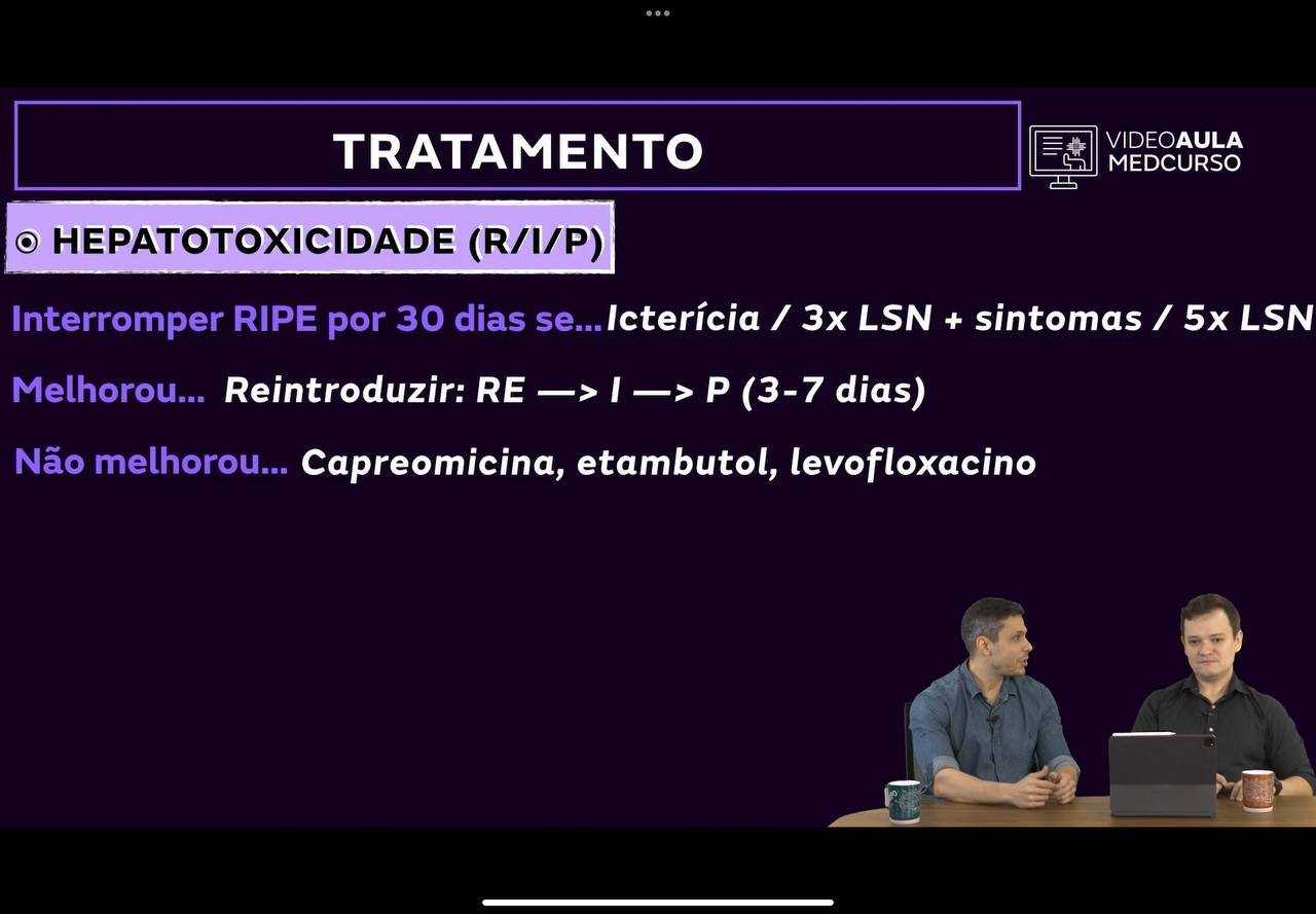 O tratamento só deve ser interrompido caso houve icterícia ou aumento de três vezes o limite superior das transaminases + sintomas (gastrointestinais por exemplo) ou aumento 5 vezes o limite superior da transaminases. **E nesses casos devemos interromper o RIPE por 30 dias e reavaliar depois, se melhorou reintroduzimos com rifampicina + etambutol e após 3-7 dias reintroduzimos isoniazida e após 3-7 dias reintroduzimos a pirazinamida. Caso não melhorar fazemos outro esquema “para o fígado não ir para o cél” com capreomicina, etambutol e levofloxacino.
