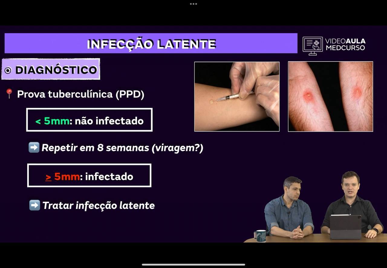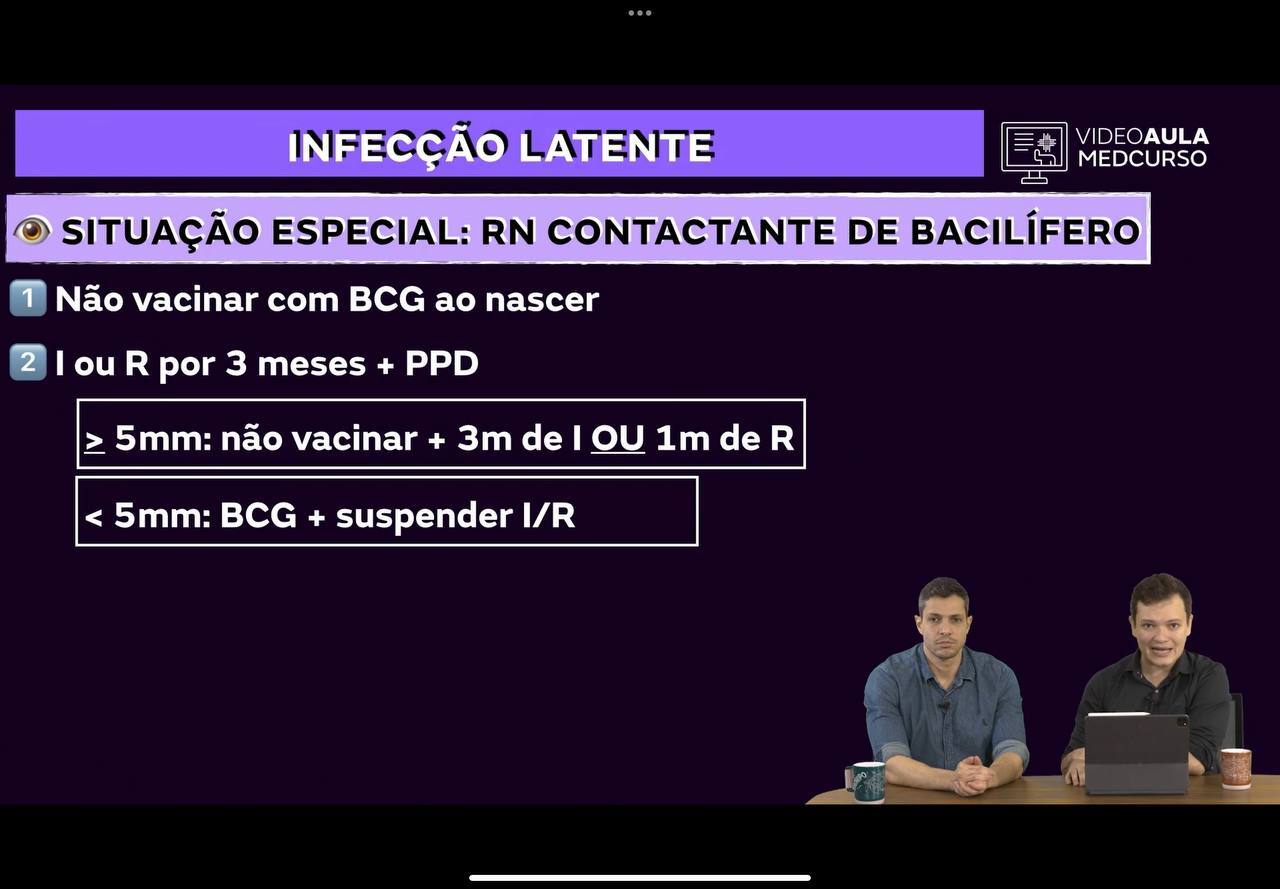 🟢Após os 3 meses do medicamento (isoniazida ou rifampicina) fazemos o PPD, caso ele venha maior igual que 5mm então não vacinamos e fazemos mais 3 meses de isoniazida ou 1 mês de Rifampicina ( pois o correto é 4 meses de rifampicina ou 6 meses de isoniazida nessa situação).