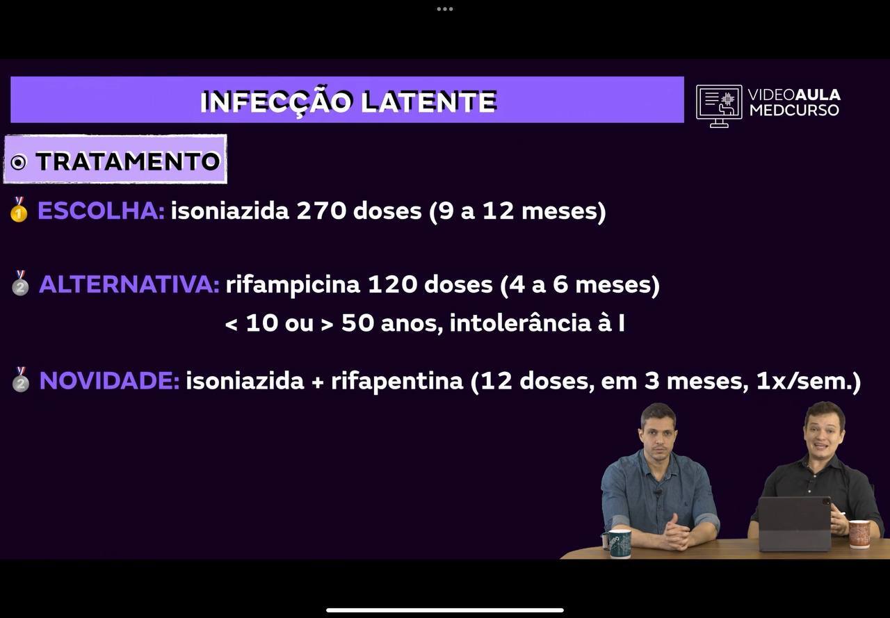 1° escolha ➡️ Isoniazida 270 doses entre 9-12 meses. O importante aqui é o paciente tomar todas as 270 doses.
