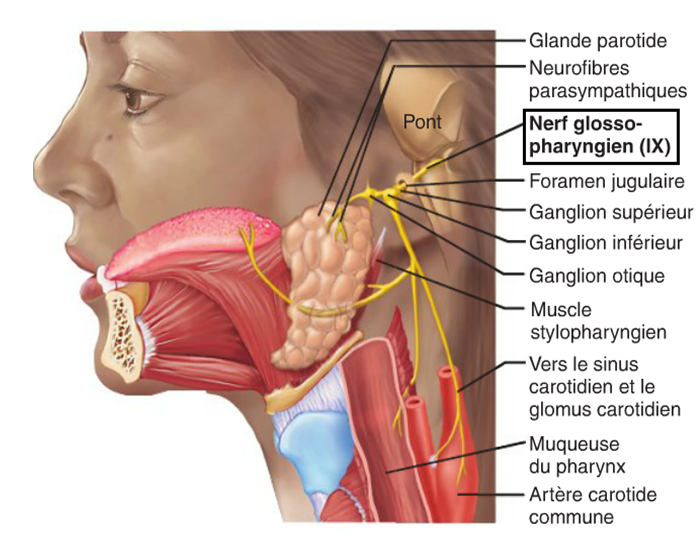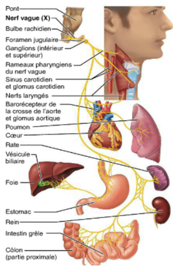 Innervation parasympathique motrice de la tête et des viscères thoraco-abdominaux (cœur, poumons, tube digestif) au-dessus de l’angle splénique.