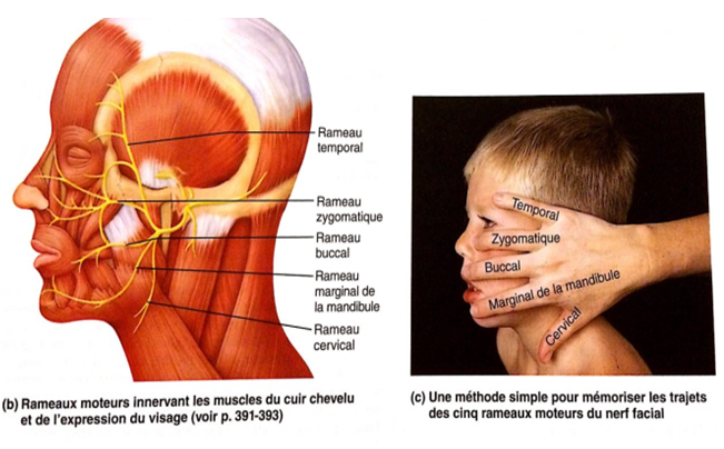 Comment s’appellent les 5 rameaux moteurs innervant les muscles du visage et du cuir chevelu (font parties du nerf facial)?