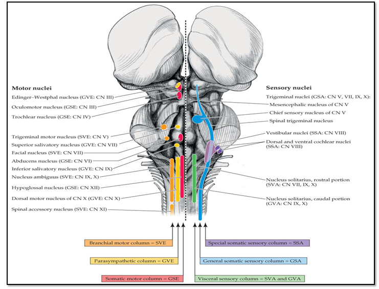 Les noyaux moteurs des nerfs crâniens sont situés plus ventralement et les noyaux sensoriels des nerfs crâniens plus dorsalement. Il y a 3 colonnes motrices et 3 colonnes sensorielles qui courent le long du tronc cérébral.