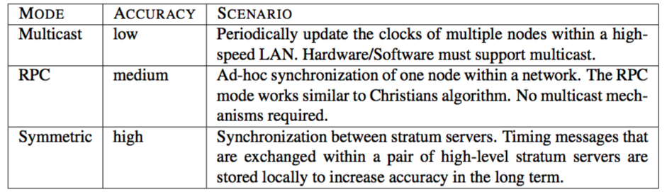 2. Name the three different synchronization modes NTP supports. For each mode assess its accuracy compared to the other modes? In addition, provide a suitable usage scenario for each mode.