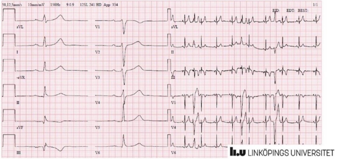 Björn transporteras till HIA. Telemetri på avdelningen visar frekventa VES samt längre och korta VT med olika fokus. I samband med episoder av längre VT har Björn yrsel. Biokemiskt noteras mindre läckage av Troponin T utan dynamik. Akut ekokardiografi visar lätt nedsatt vänsterkammarfunktion samt hypo-/akinesi inferiort.