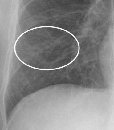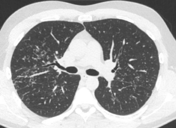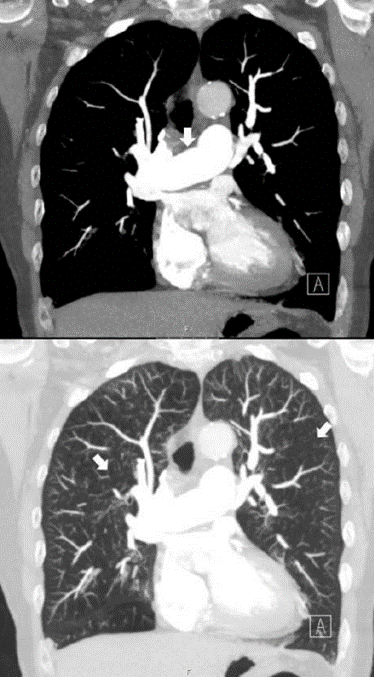 Notera hur breddökad truncus pulmonalis (indikerad med pil på den övre bilden) är i förhållande till arcus aortae, vilket är ett tydligt tecken på högt tryck i lungkretsloppet. Notera också generellt fläckvis varierande attenuering (kärlen syns inte, svart bild liksom, kan innebära luft som fastnar i experium) i lungparenkymet (indikerat med pilar i nedre bilden), ett mönster som kallas mosaik pattern. Ett litet infiltrat ses lateralt-basalt i höger lunga.