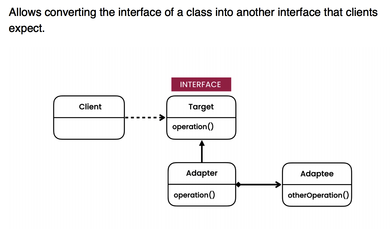 Allows converting the interface of a class into another interface that clients expect.