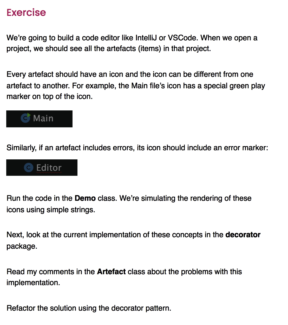 What is an excercise using the Decorator Pattern?