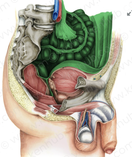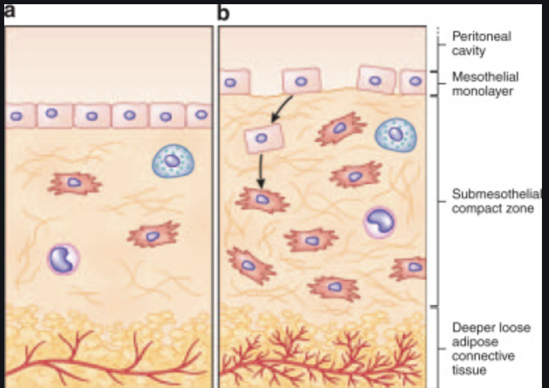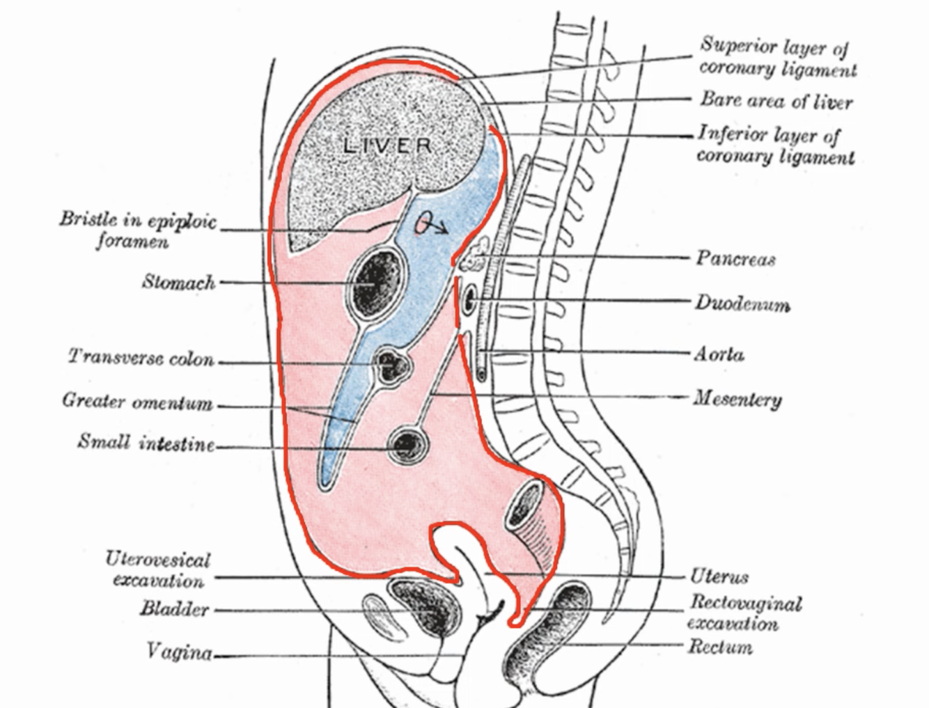 What does the peritoneum adhere to and is it the parietal of visceral peritoneum?