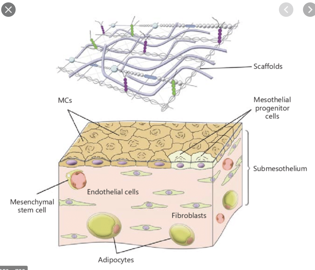 Where does the visceral peritoneum line, and what type of cells is this composed of?