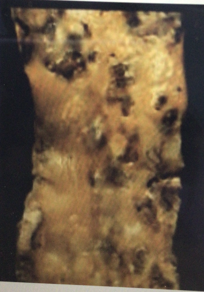 An 80 year old man with long standing diabetes and systemic hypertension dies of congestive heart failure. The luminal surface of that abdominal aorta is shown: