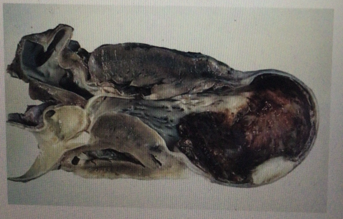 A 68-year-old female with a history of diabetes mellitus expires suddenly of cardiac arrest. The patient suffered a massive anterior myocardial infarction one year earlier. the heart autopsy is shown: