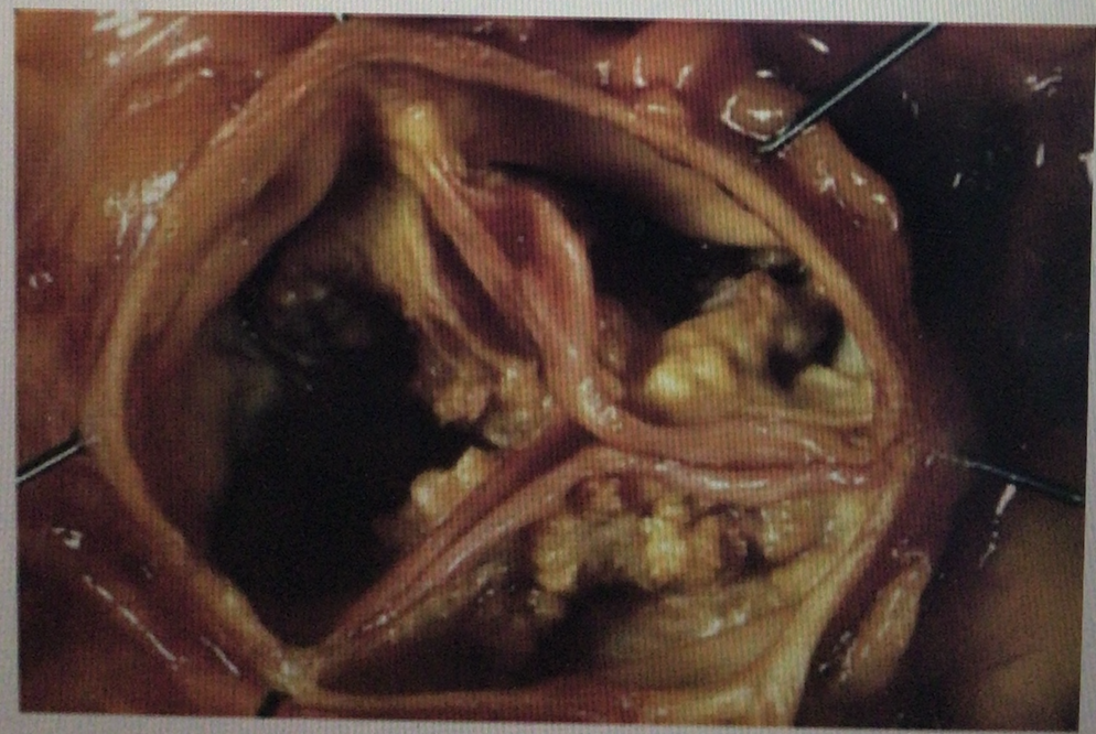 A 78 year old male with a history of recurrent syncope undergoes surgery for aortic valve disease. A hard, markedly deformed valve is shown: