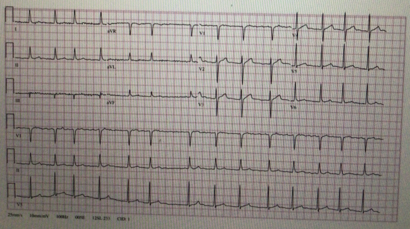 A middle aged man with hypercholesterolaemia, and who has smoked all of his life presents to the emergency department with crushing retrosternal chest pain. His ECG is shown: