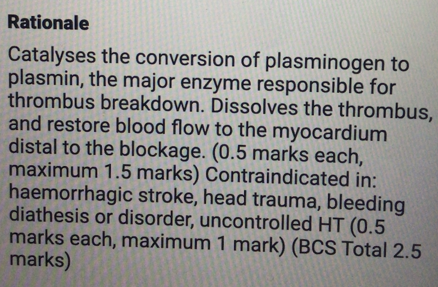 Describe the mechanism of action of this agent and how it might assist this patient. List two contraindications to prescribing tPA.