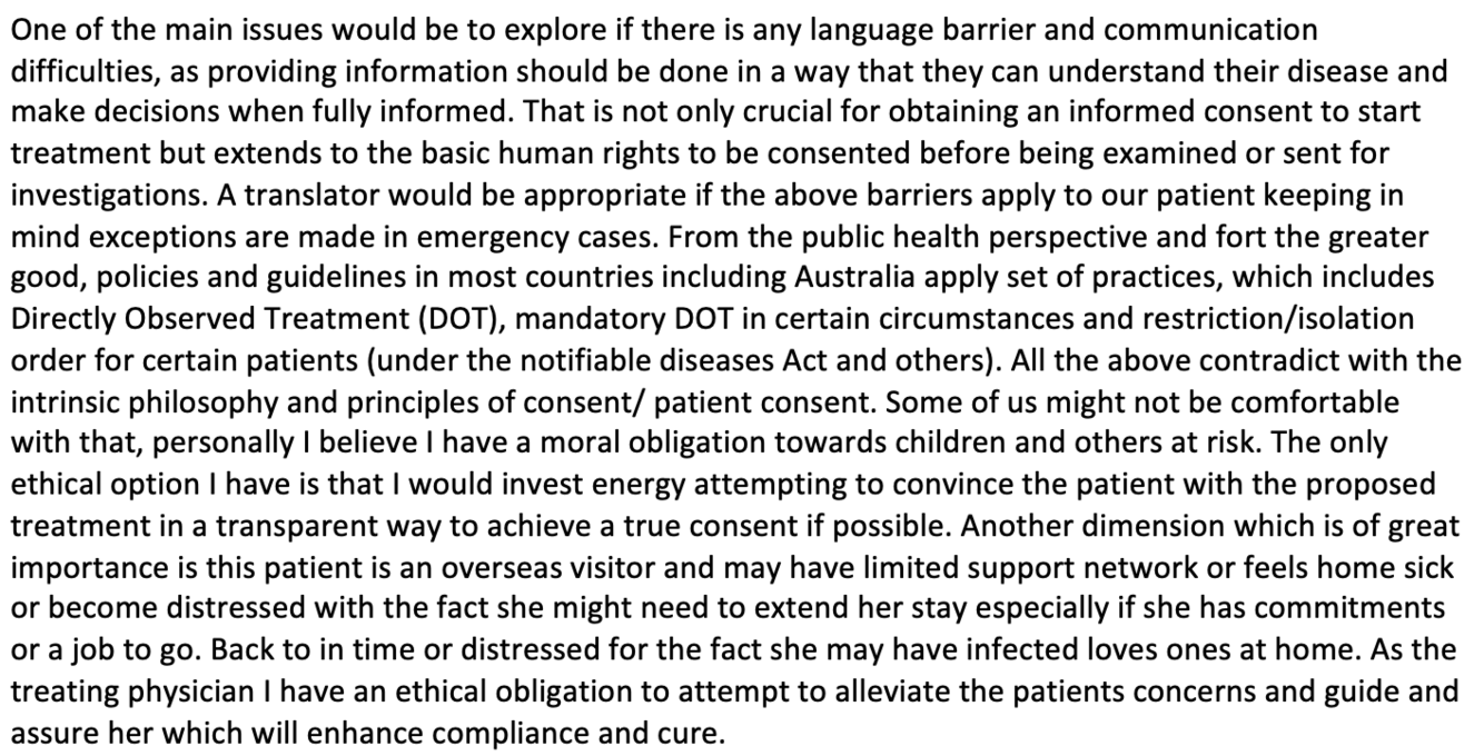 Your patient is a 71-year-old female with pulmonary TB who is visiting from the Philippines. She will require at least 6 months of treatment.