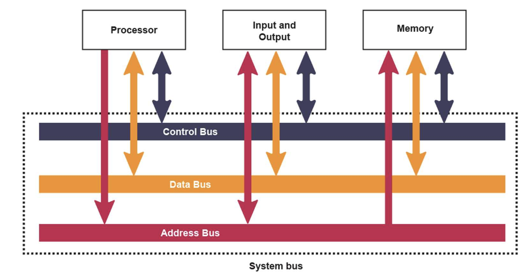 The system bus consists of three separate buses carrying control signals, addresses and data