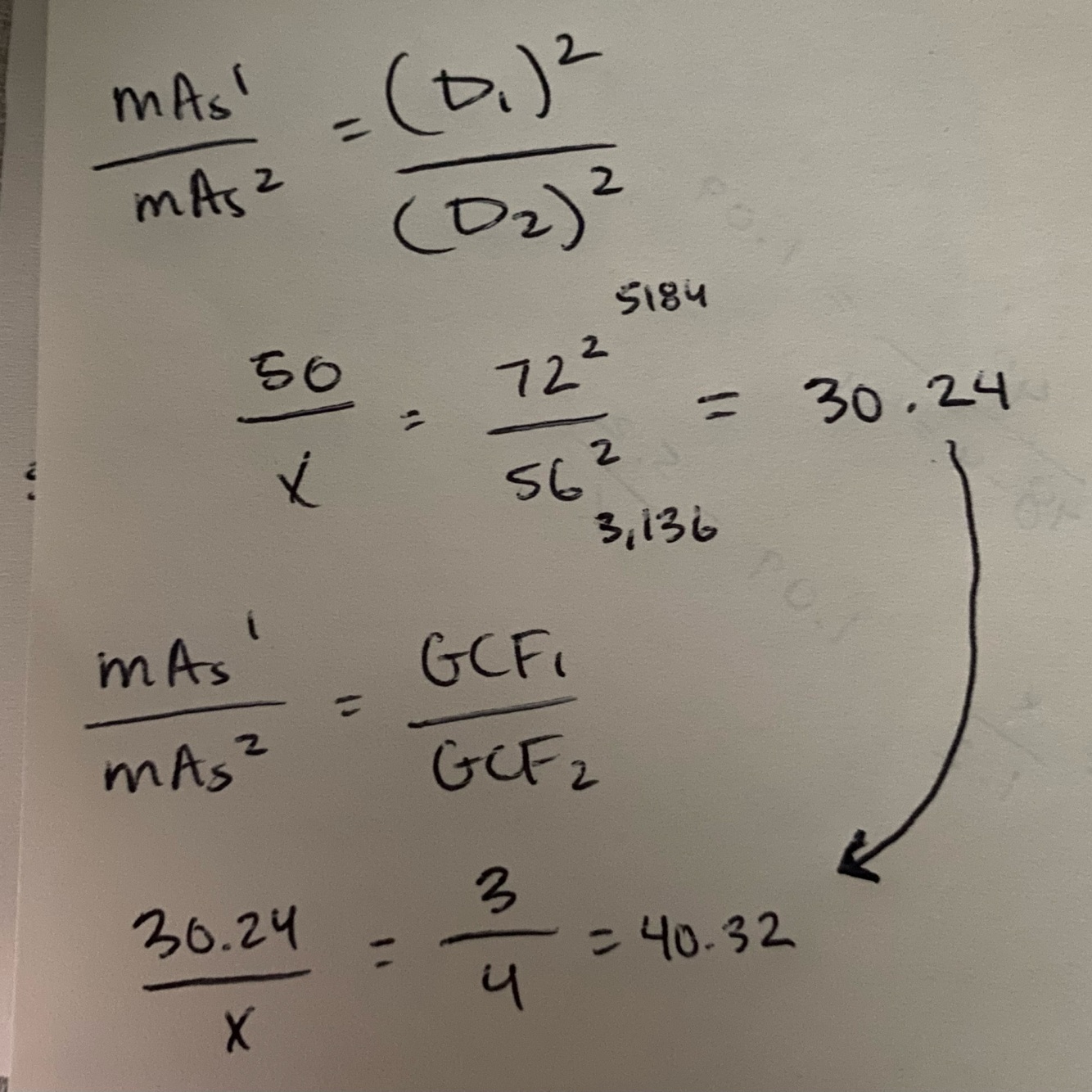An image is taken at 72” SID using 80 kVp, 50 mAs and a 6:1 Grid. What should the new mAs be in order to maintain IR exposure if the SID were changed to 56” and the grid changed to a 8:1?