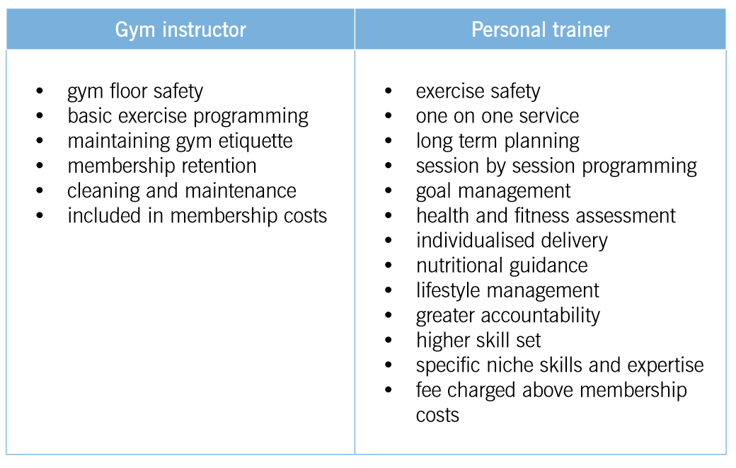 This means that the PT must have a greater knowledge base than a fitness instructor, be qualified to deal with a larger cross-section of the community and train to a higher level of skill and competency than a fitness instructor.