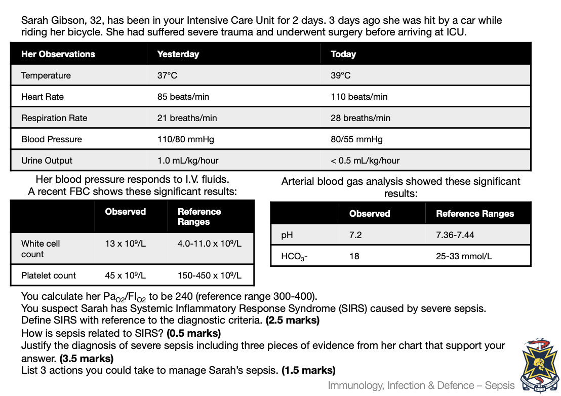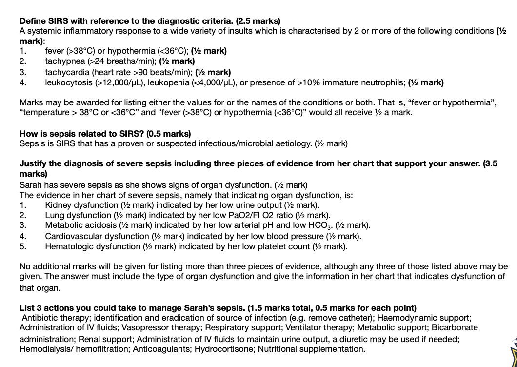 Differentiate the terms Systemic Inflammatory Response Syndrome (SIRS), sepsis, severe sepsis and septic shock (4 marks).