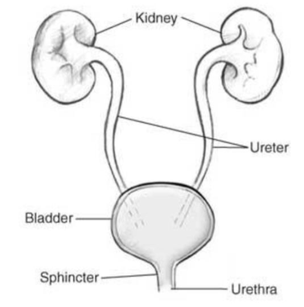 ureter + bladder + urethra quite similar * all transitional epithelium * wavy mucosa profile allows expand acommodate urine * sub-mucosa w lamina propria * muscularis w inner longitudinal, middle circular + outer longitudinal (allow contraction) * then serosa (loose CT) in peritoneal cavity OR adventitia (loose CT) when embedded in other tiss | bladder has thicker layers sm musc (more contraction)