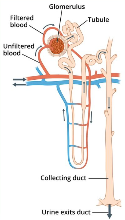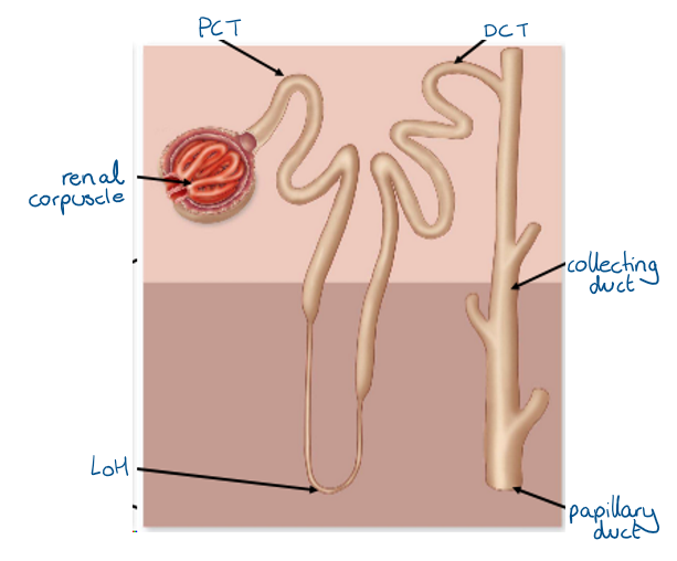 5. collecting duct - several nephrons join for variable secr + reabsorp water + ions (more reg)