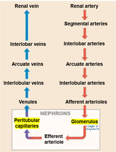 renal arteries directly branch off aorta, giving 20-25% CO -> renal veins
