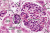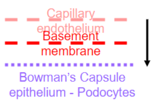 * caps = porous endothelium * thick glomerular basement mem (physical barrier = size filter) * visceral epithelium (podocytes) - part Bowman's capsule * capsule space filtered into * parietal epithelium (simple squamous) w thick basal lamina - other part Bowman's capsule 1st 3 make up 3 components filtration barrier | mols captured base mem phagocyt by mesangial cells, podocytes phagocyt