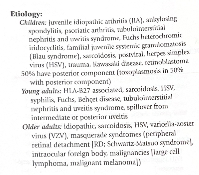Inflamación intraocular que no siempre está confinada a tracto uveal (iris, cuerpo ciliar y coroides) porque puede dañar tejidos oculares (epiesclera, esclera, córnea, cristalino, retina, vasos retinianos, nervio óptico y vítreo).