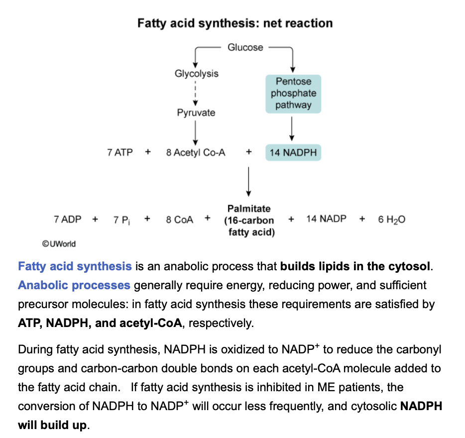 If lower phospholipid levels in ME patients are due to inhibition of fatty acid synthesis, researchers would most likely observe which of the following?