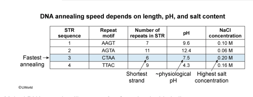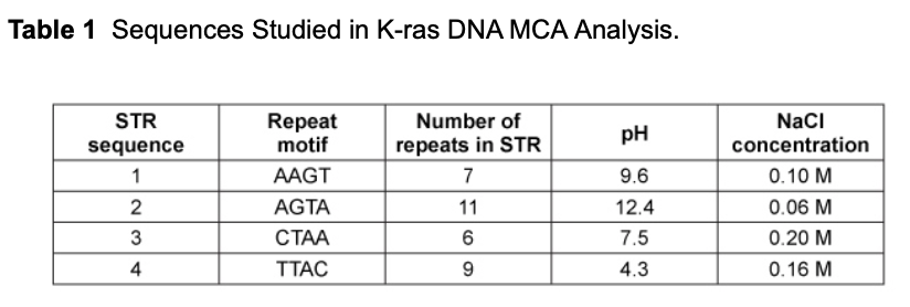 Prior to inserting the STR sequences into K-ras DNA, the researchers perform MCA analysis using only the double-stranded STR sequences. Which sequence from Table 1 would have the fastest reannealing time in this experiment?