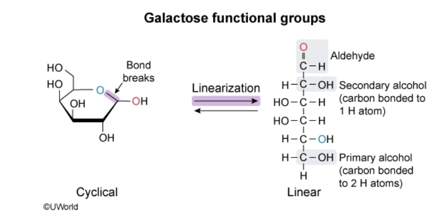 After galactose is released from GC and linearized, it contains all of the following functional groups EXCEPT: