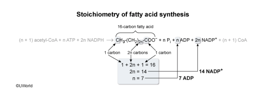 where n is a positive integer. Based on this, how many ADP and NADP+molecules will be produced during synthesis of a 16-carbon fatty acid?