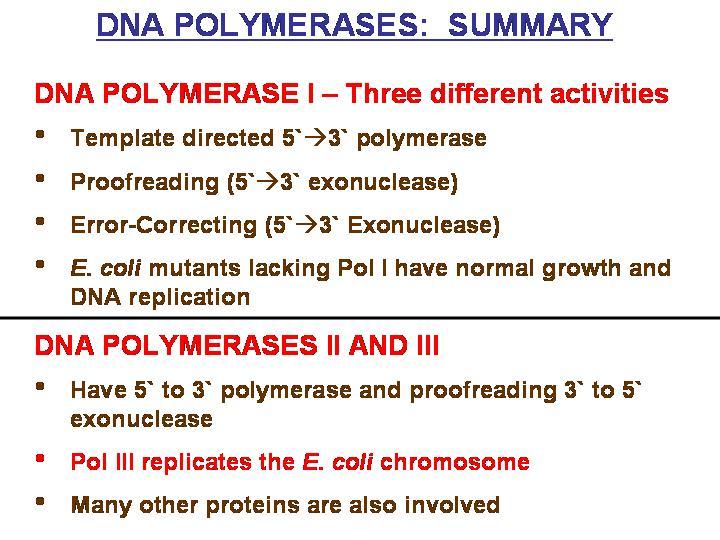 DNA Polymerase III: elongates DNA strand by adding deoxynucleotides to 3’ end. Elongates lagging strand and proofreads. Replicates the E. Coli chromosome