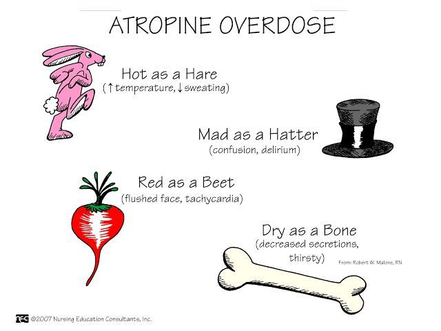 Tx overdose with phyostigmine (not neostigmine because does not cross BBB into CNS due to quaternary structure)