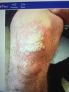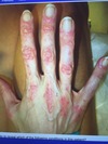 Presents with + Nokolsky sign, epidermal necrolysis, fever, pain